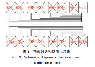 方案2:如果采用傳統(tǒng)的精密列頭柜配電方案,則需為兩列機(jī)柜配置1個(gè)精密列頭柜,并向每面機(jī)柜提供雙電源供電。如圖3所示。