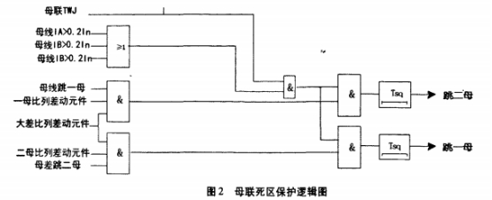 若母聯(lián)開關和母聯(lián)TA之間發(fā)生毛病,斷路器側母線槽跳開后毛病依然存在,正好處于TA側母線槽小差的死區(qū),為進步保護動作速度,本設備專設了母聯(lián)死區(qū)保護,其邏輯框圖如圖2。