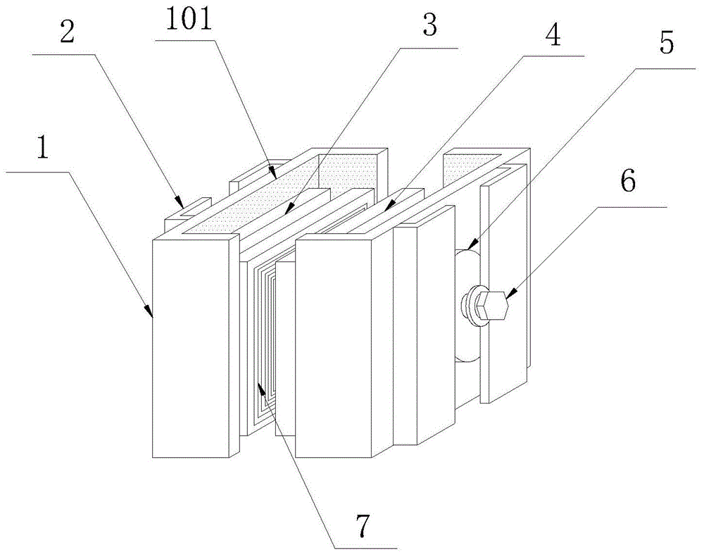 2.根據(jù)權(quán)利要求1所述的一種環(huán)氧樹脂澆注母線槽聯(lián)接器,其特征在于,所述鋼架(1)的內(nèi)周圍面設(shè)置有絕緣層(101),所述絕緣層(101)的材料為環(huán)氧樹脂。